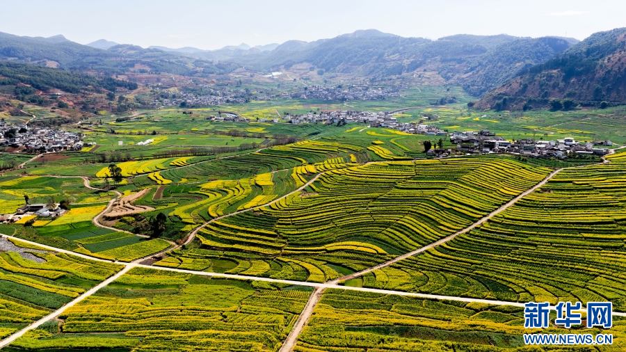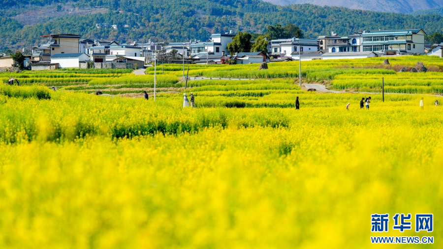 绵延的油菜花海与村庄、蓝天白云相互映衬(2月20日摄)。新华网发(黄申源 摄)