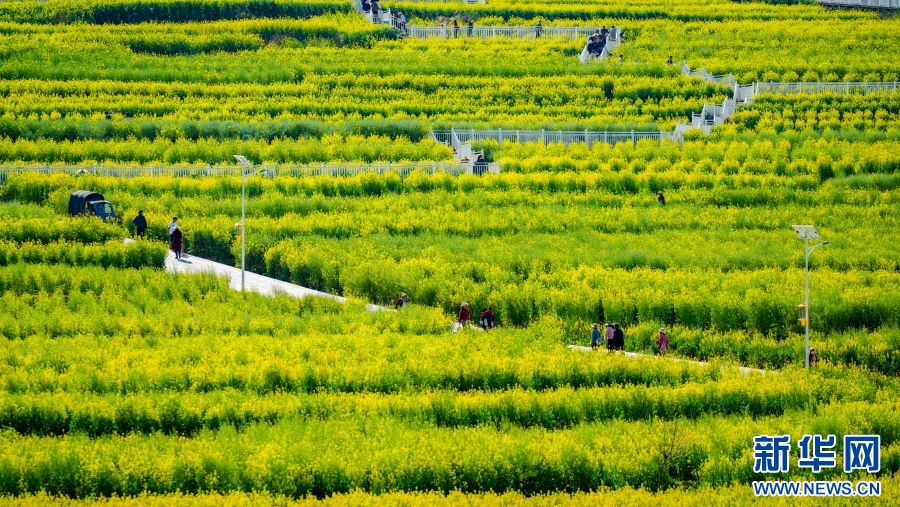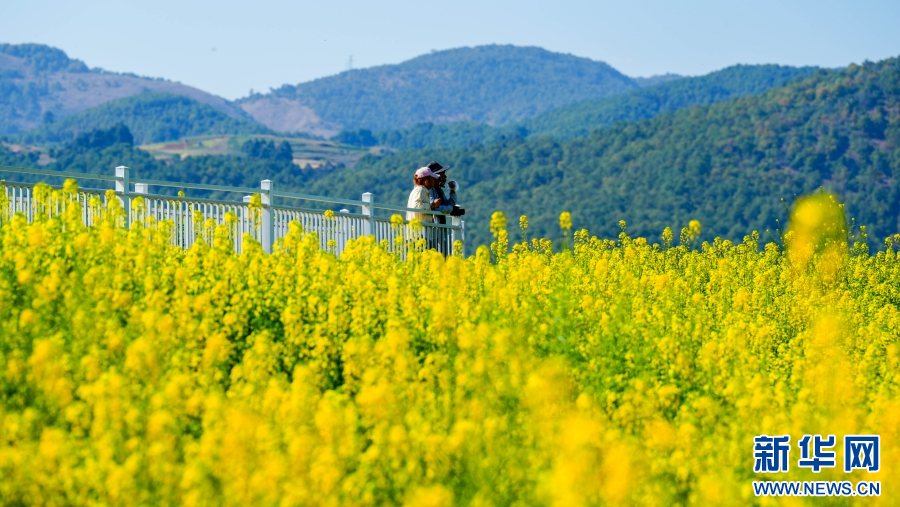 游客在栈道上眺望油菜花田(2月20日摄)。新华网发(黄申源 摄)