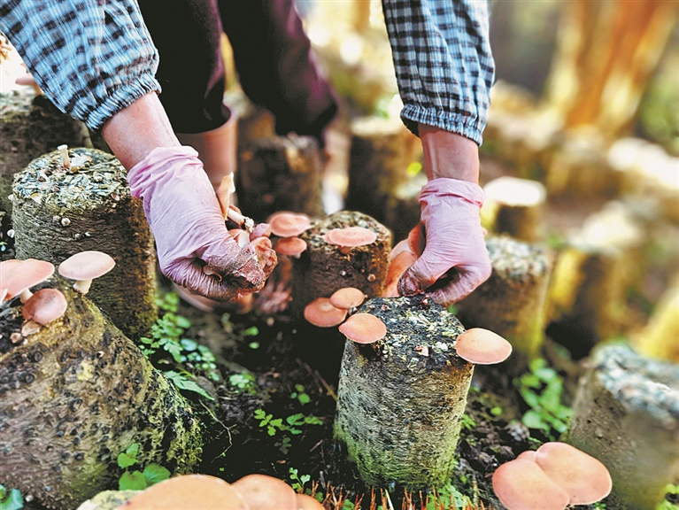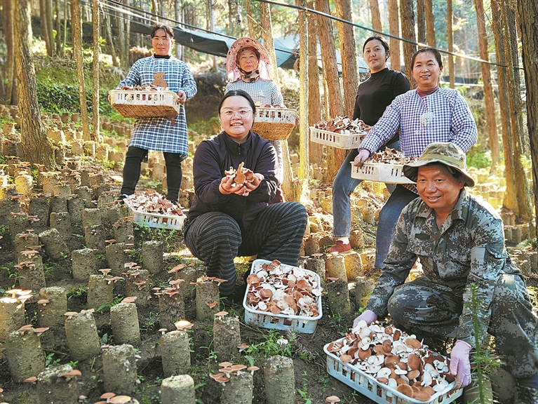 “这茬小香菌长得特别好,一天能采收不少。”陆有英笑着说,“下午就有车来收购,直接发往全国各地。”不远处的林间,还有许多村民正在忙碌。他们悉心照料的不仅是这片青山,还有林下“长”出的新希望。