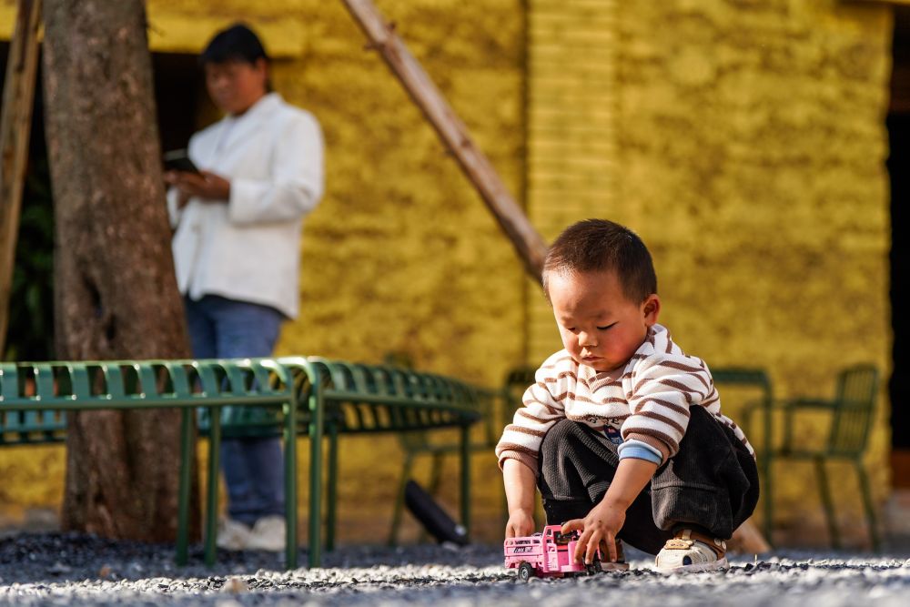 ↑ 3月24日,一名儿童在白雾村玩耍。