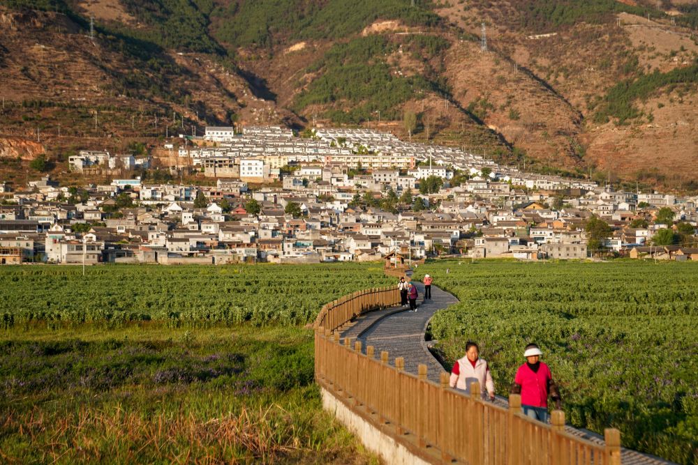 ↑ 3月24日,村民在白雾村田间道路上散步休闲。