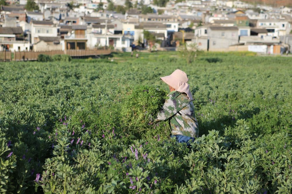 ↑ 3月24日,村民在白雾村的蚕豆地里除草。