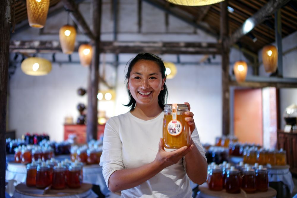 ↑ 3月24日,一名村民在展示醋饮产品。