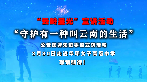 3月30日,“云岭星光”宣讲活动——“守护有一种叫云南的生活”公安民警先进事迹宣讲活动将走进华坪女子高级中学,敬请期待。