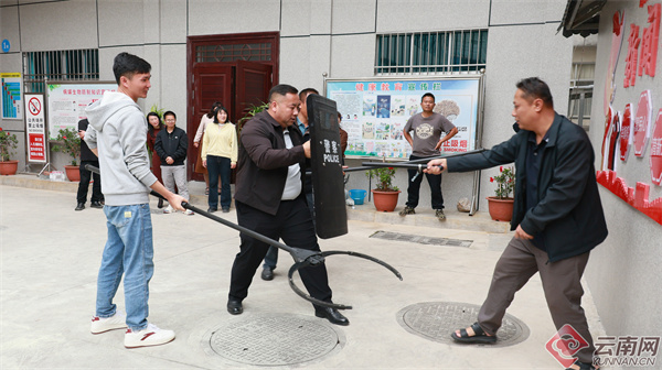 另一边,气氛骤然紧张。一名手持凶器的“暴徒”疯狂冲向办公区大门,安保人员迅速启动一键报警,手持防暴钢叉与盾牌组成“铜墙铁壁”。几分钟后,公安特警呼啸而至,擒拿、格斗、上铐,动作行云流水,“暴徒”应声倒地。