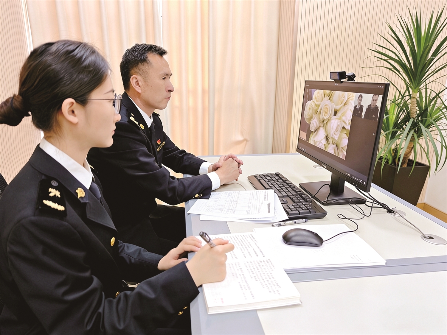 海关关员通过远程视频连线对出口鲜切花进行实时监管。 通讯员 戴玮琪 摄