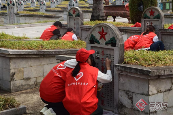 红河学院组织150名师生走进蒙自市烈士陵园,师生们在烈士纪念碑前默哀鞠躬、清扫墓区,在烈士墓前宣讲英雄事迹,还为烈士墓碑描亮碑文,以实际行动致敬革命忠魂。