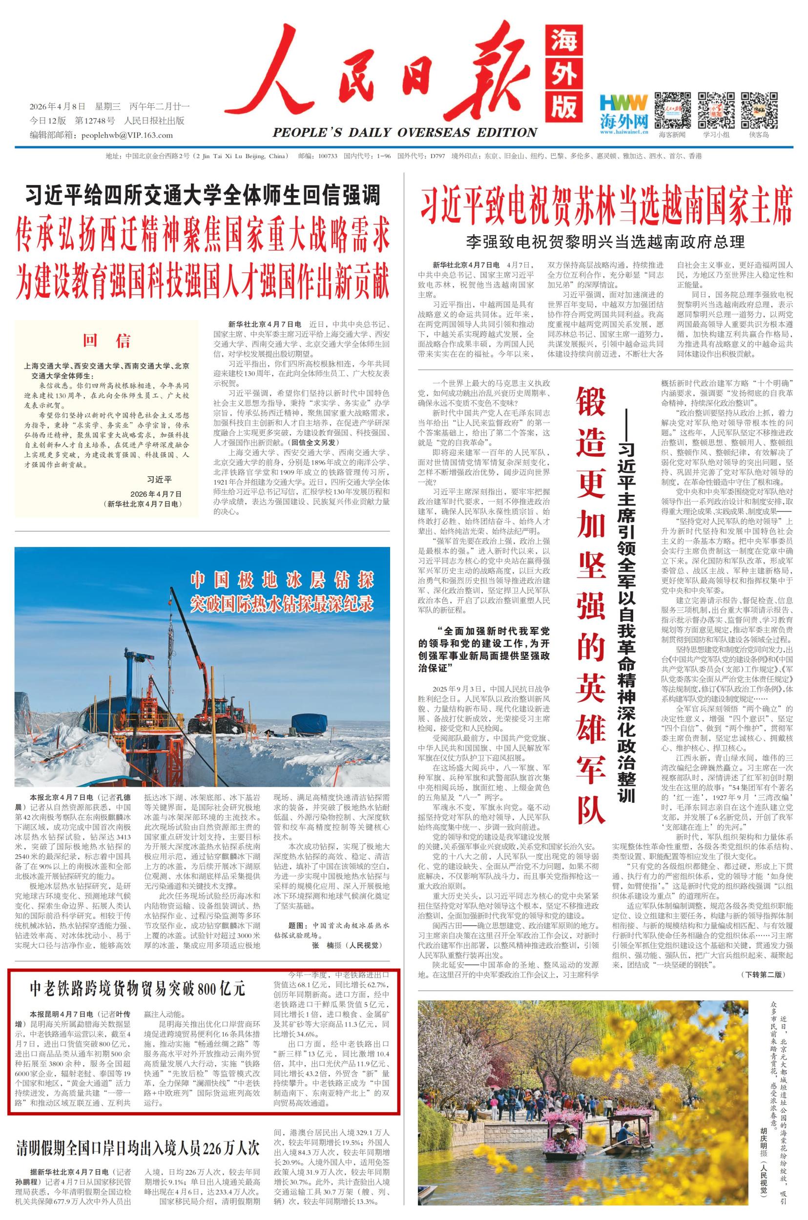 昆明海关所属勐腊海关数据显示,中老铁路通车运营以来,截至4月7日,进出口货值突破800亿元,进出口商品品类从通车初期500余种拓展至3800余种,服务全国超6000家企业,辐射老挝、泰国等19个国家和地区,“黄金大通道”活力持续迸发,为高质量共建“一带一路”和推动区域互联互通、互利共赢注入动能。