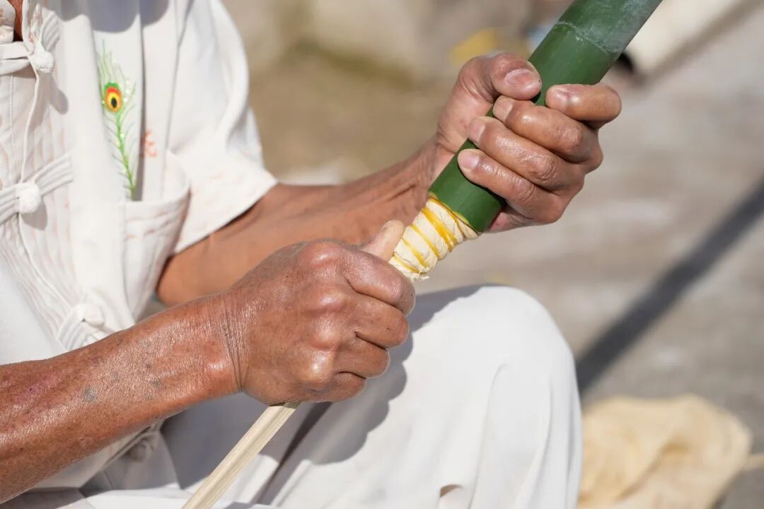 将布料头插入新鲜竹子管身中。陇川县融媒体中心 杨敏 摄