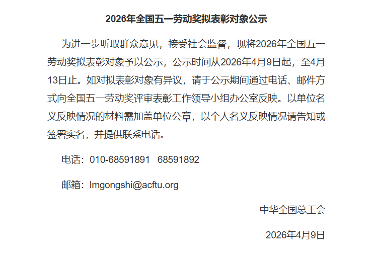 2026年全国五一劳动奖拟表彰对象公示