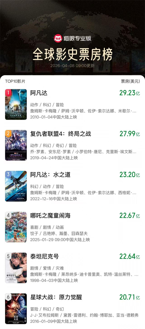 云南网讯(记者 李子楠)据猫眼专业版数据显示,截至4月8日,国产动画电影《哪吒之魔童闹海》(简称《哪吒2》)全球累计票房已达22.67亿美元,超越詹姆斯·卡梅隆执导的经典巨制《泰坦尼克号》(22.64亿美元),跃居全球影史票房榜第四位。