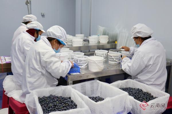当地村民在车间里分拣打包蓝莓