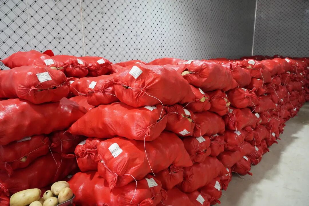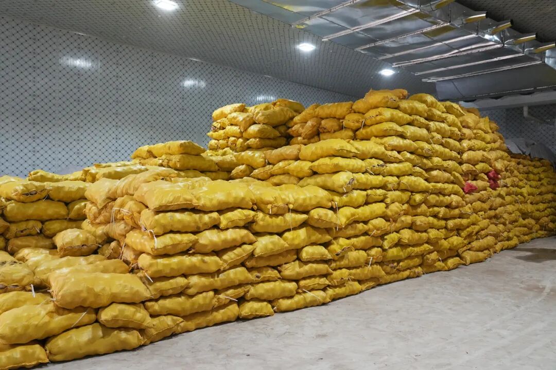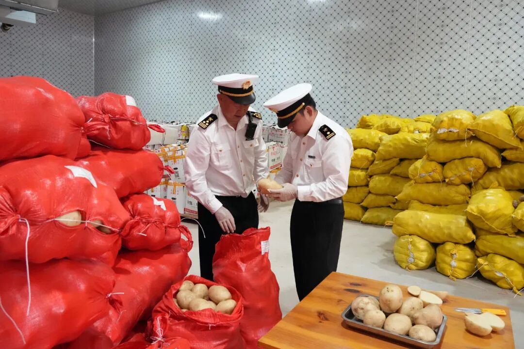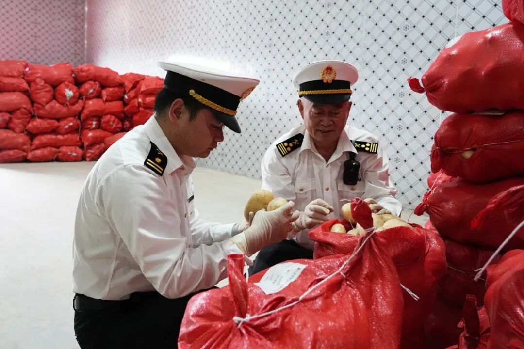 在盈江县华悦进出口有限公司的冷库中,一袋袋表皮光滑、薯形整齐的冬马铃薯正等待装车。盈江海关关员对这批出口货物进行查验,确保其符合出口标准。