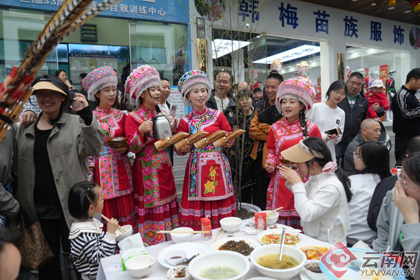 鲜香的春笋不仅留住了本地人的乡愁,更吸引了外地游客慕名而来。大家在品尝中感受春日滋味,在民族特色文艺展演中读懂魅力威信。“今天我们吃的这桌菜印象最深的就是炒竹笋,还有刺老包,值得来尝试,这种长街宴我是第一次体验,感受到了扎西人民的热情。”来自昆明的游客陈兰说。
