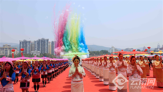4月13日,西双版纳傣族自治州傣历1388年新年节(2026年泼水节)庆祝大会举行,全州各族同胞身着节日盛装与五湖四海的宾朋齐聚澜沧江畔,共庆傣历新年,共叙胞波情谊。