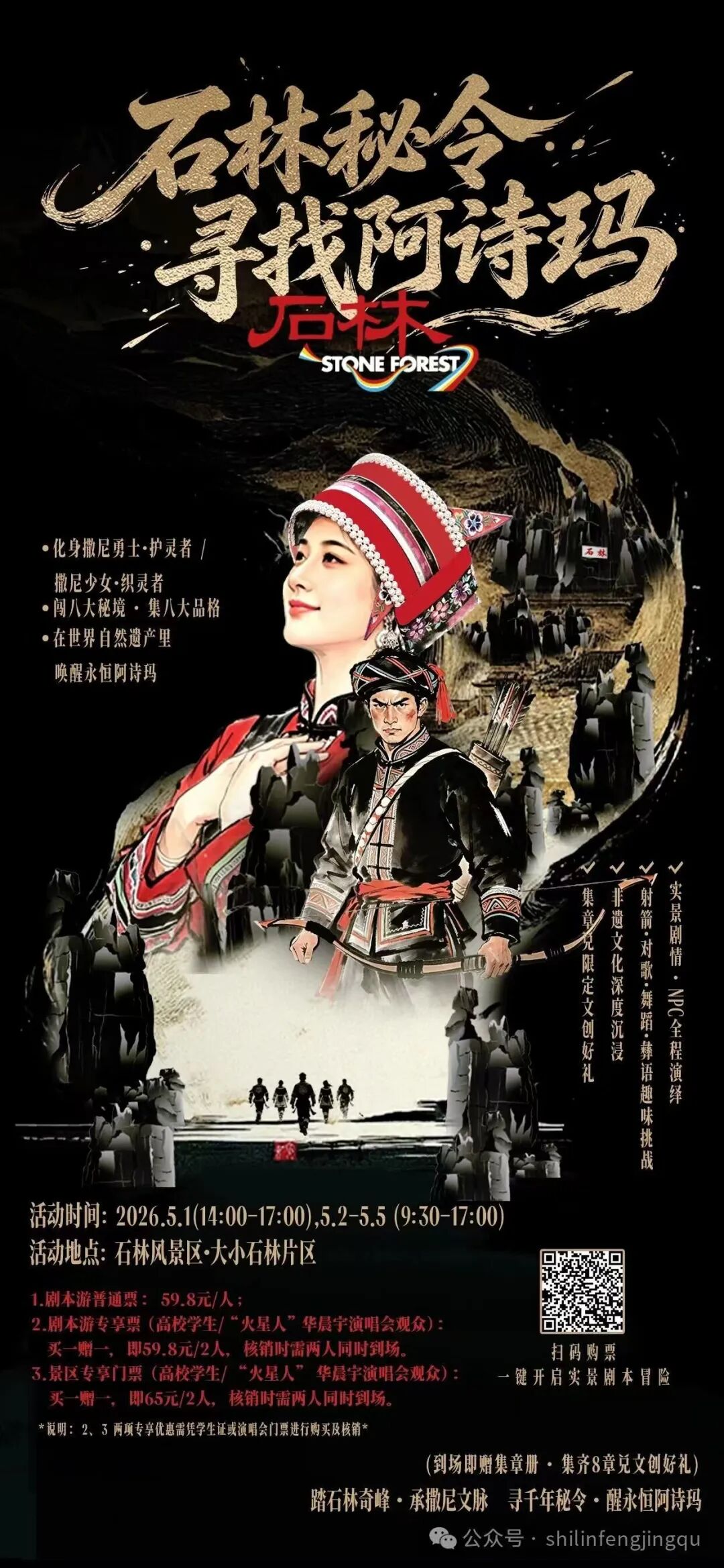 五一期间,石林景区变身大型实景剧场,重磅推出《石林秘令·寻找阿诗玛》沉浸式剧本游,让你在探秘石海的同时化身剧中人;每天上午的迎宾巡游、全天候的非遗市集以及小石林出口草坪的“阿诗玛·音为遇见你”音乐汇,将传统撒尼文化与现代潮流完美融合,更有网红打卡点等你来拍。