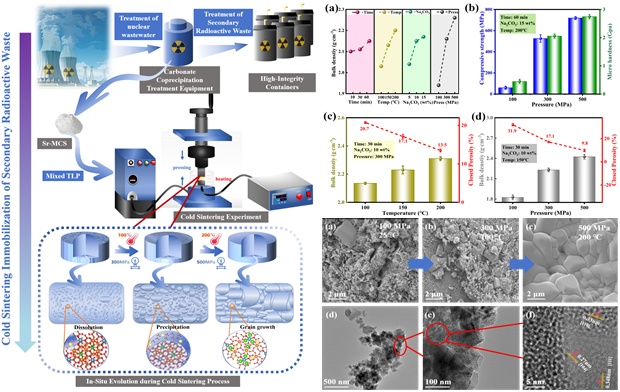 福岛核事故后,ALPS系统处理废水时产生的含锶镁钙混合碳酸盐污泥(Sr-MCS)是困扰全球核安全领域的典型二次放射性废物,不仅放射性核素含量高、化学组成复杂,更为关键的是,传统处理方法难以兼顾安全性与经济性,成为行业内难以突破的技术瓶颈。此前,传统高温固化技术(如玻璃固化)需1000℃以上高温,极易导致碳酸盐分解挥发,进而降低固化体致密性和结构稳定性,难以满足实际工程应用的严苛需求。为破解这一行业痛点,团队秉持“创新破局”的思路,创新性地将冷烧结技术(Cold SinteringProcess)应用于放射性污泥固化处理,自主开发了基于低温高压条件的锶固化新工艺。该技术以15wt% 1M Na₂CO₃为瞬态液相,在200℃低温、500 MPa高压条件下烧结1小时,成功将含锶碳酸盐污泥转化为高密度、高稳定性的陶瓷固化体。材料表征结果表明,固化体相对密度达96%,抗压强度高达719 MPa(约为普通混凝土的10倍),显微硬度达2.69 GPa,展现出优异的机械性能。
