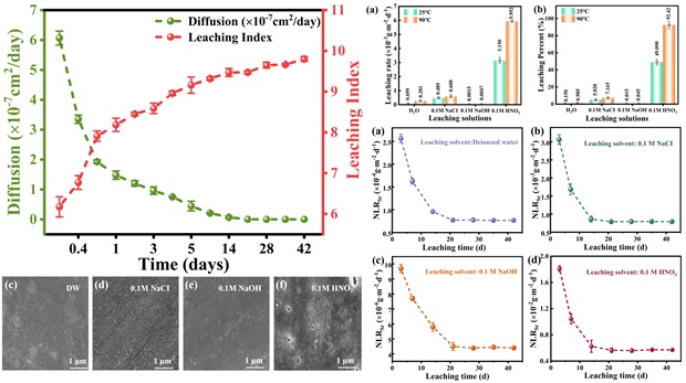 研究采用国际标准的MCC-1静态浸出、ANSI/ANS-16.1加速浸出和PCT产品一致性测试,全面评估固化体的化学耐久性。结果表明,固化体在90℃下浸泡42天后,去离子水中锶浸出率低至5.95×10⁻⁵ g·m⁻²·day⁻¹,浸出指数达9.8,远超国际核废料处置安全标准。在酸性(0.1M HNO₃)、碱性(0.1M NaOH)及盐溶液(0.1M NaCl)等严苛环境中,固化体仍保持结构完整,表面仅轻微腐蚀,展现出超稳定的化学耐久性。