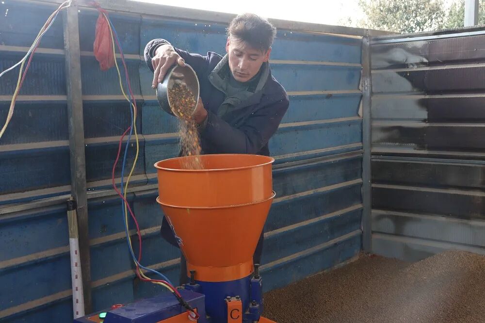 王飞在科学调配饲料。吴倩 摄