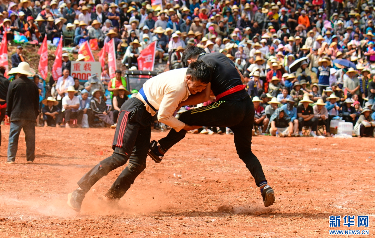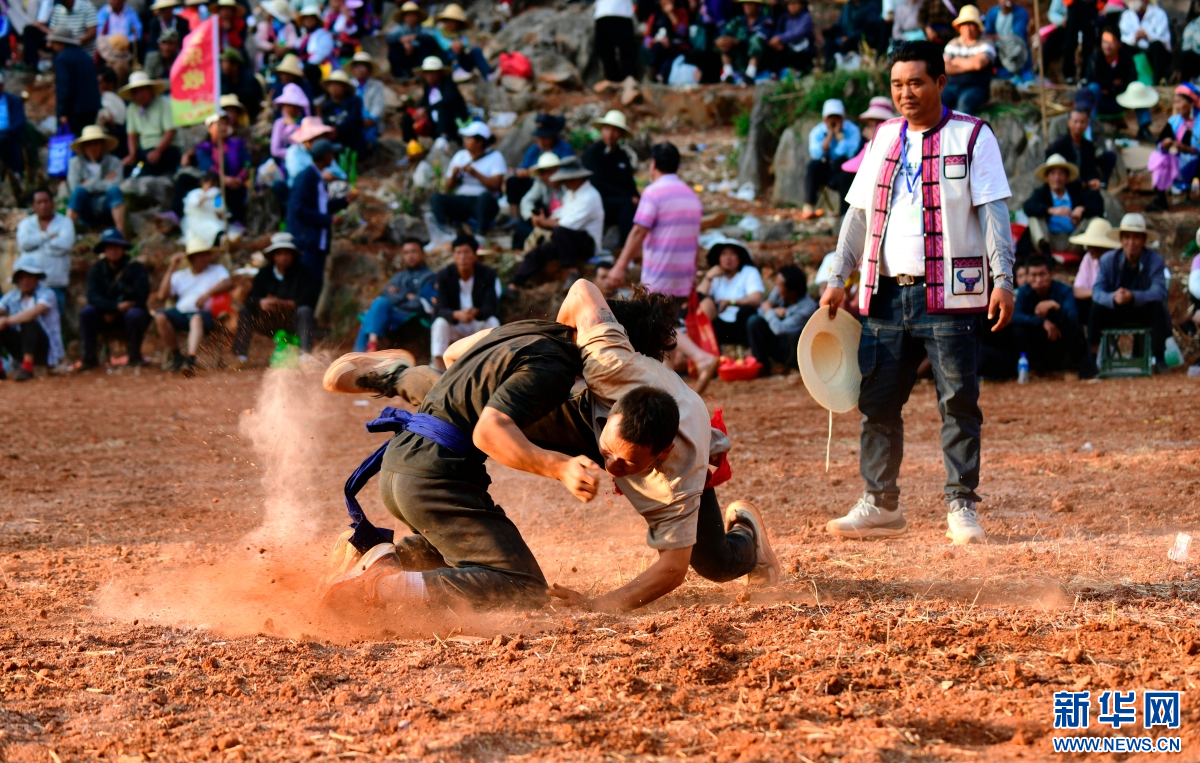 云南省弥勒市西一镇油榨村,彝族摔跤比赛现场尘土飞扬、氛围热烈(4月19日摄)。新华网发(普佳勇 摄)