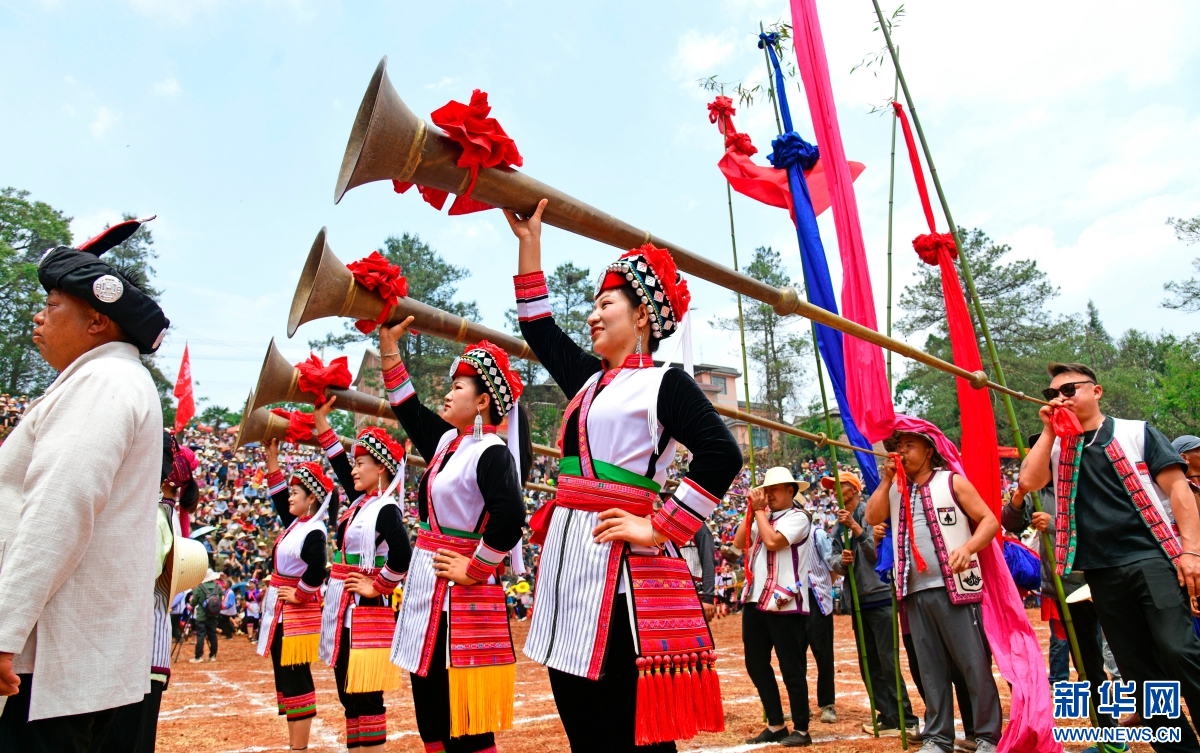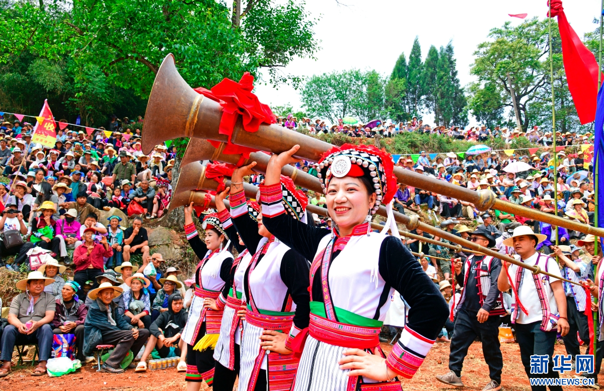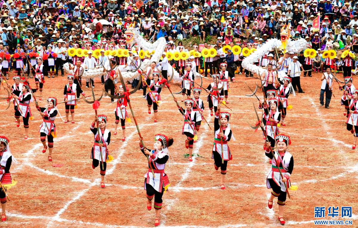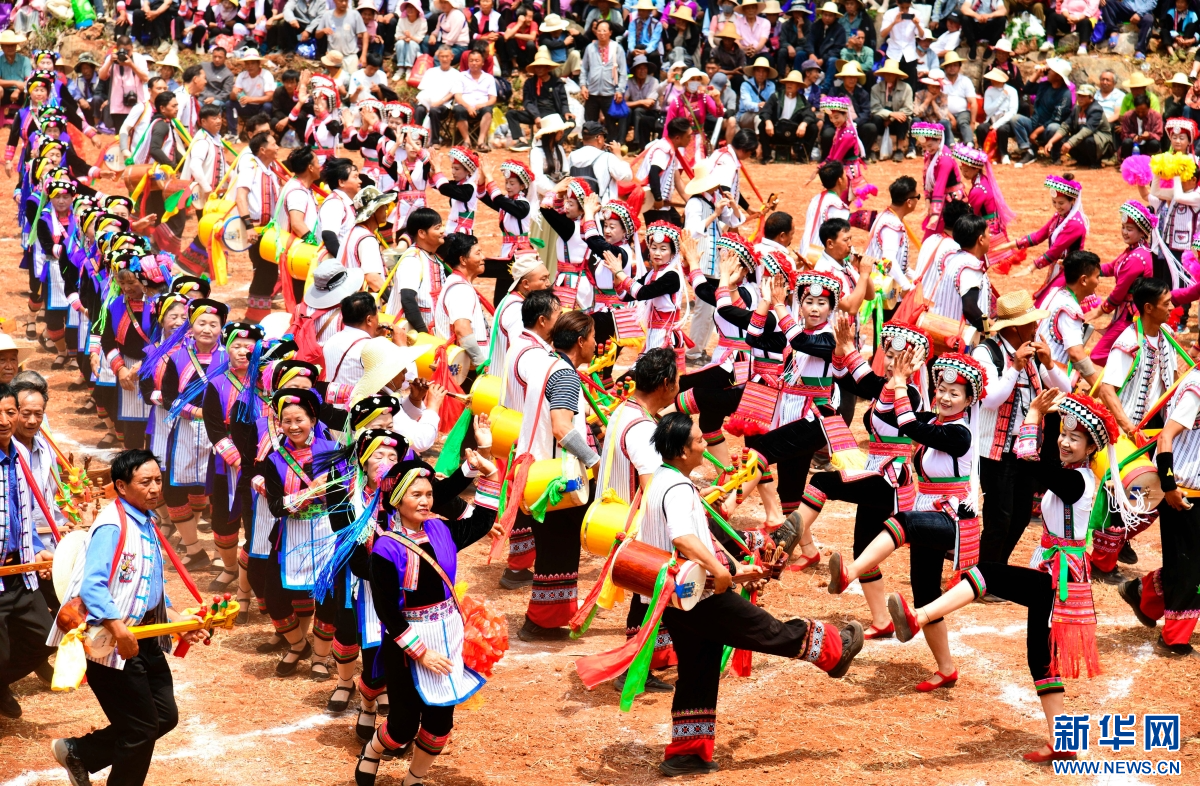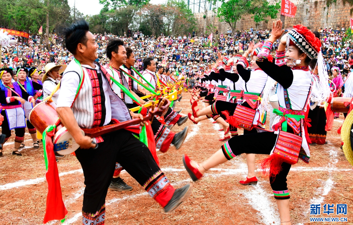 云南省弥勒市西一镇油榨村,彝族摔跤比赛前,村民带来特色文艺节目与民俗展演(4月19日摄)。新华网发(普佳勇 摄)