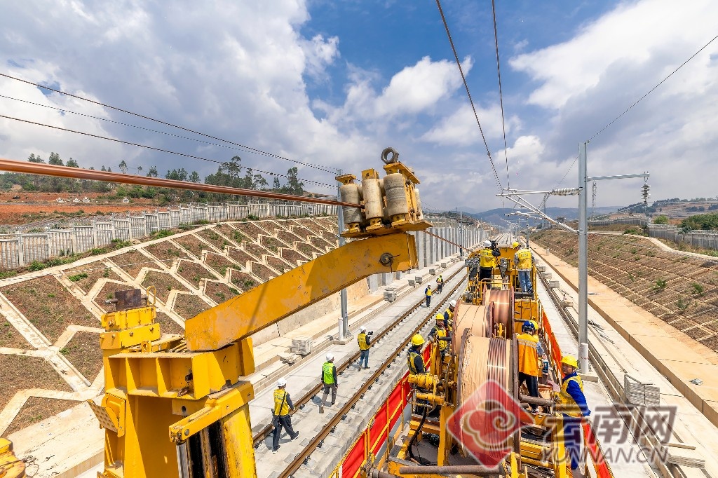 上午11时许,在云南省昆明市寻甸回族彝族自治县,随着放线车平稳启动,经过45分钟的紧张作业,首条接触网导线精准架设到位。经现场技术人员复测确认,各项关键指标均符合设计要求,实现一次达标。