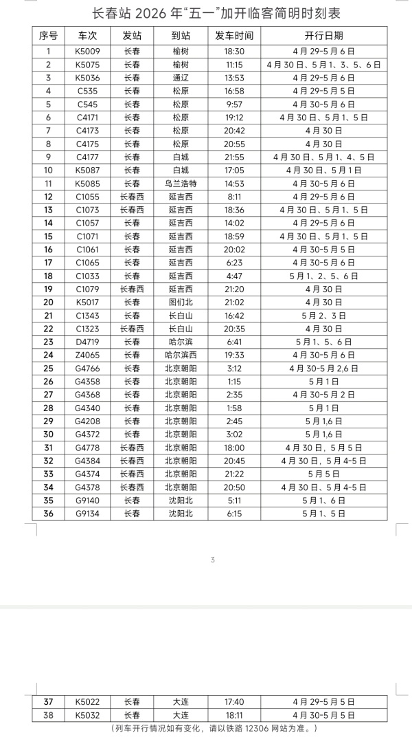 加开临客,保障出行需求。今年“五一”假期,长春站客流以中短途为主,热门方向集中在吉林、白城、延吉、大连、哈尔滨、北京等地,旅游流、探亲流将成为客流主力。长春站合理调配运力,实施“一日一图”计划,加开始发临时旅客列车38列,安排动车组重联123列,最大限度满足旅客出行需求。针对假期旅游流增加的实际,长春站开行长春(西)至北京朝阳G4766、G4368次等多趟高铁列车,为旅客前往北京出游踏青提供出行保障;加密长春(西)至延吉西的列车开行频次,加开C1055、C1057、C1071次等动车组列车,方便旅客奔赴延边品尝朝鲜族特色美食,畅享假期。