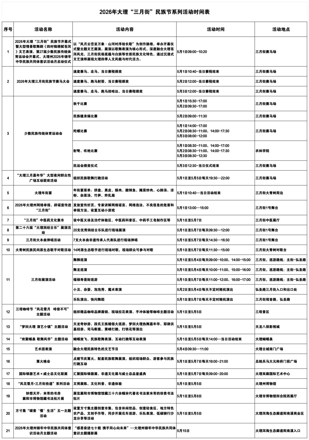 5月1日9时,开幕式将在三月街赛马场举行,大型情景歌舞剧《四时锦绣赋苍洱》同步上演,以大理四季风光为脉络,用情景与歌舞演绎苍洱人文,是三月街最具仪式感的开场。